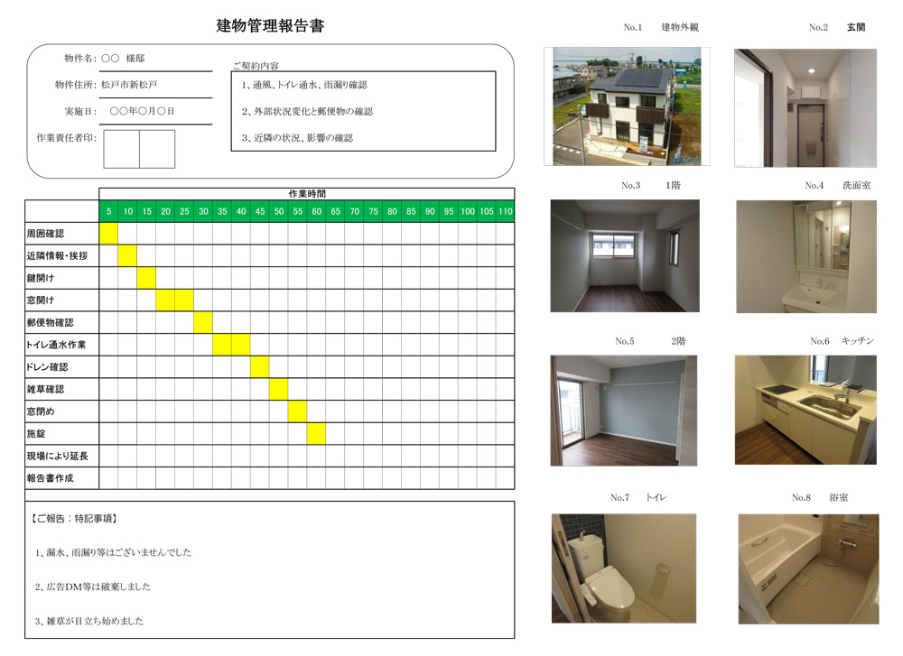 安心管理プラン、マンション管理プランにつきましては、空き家の巡回後、報告書を送付いたします。