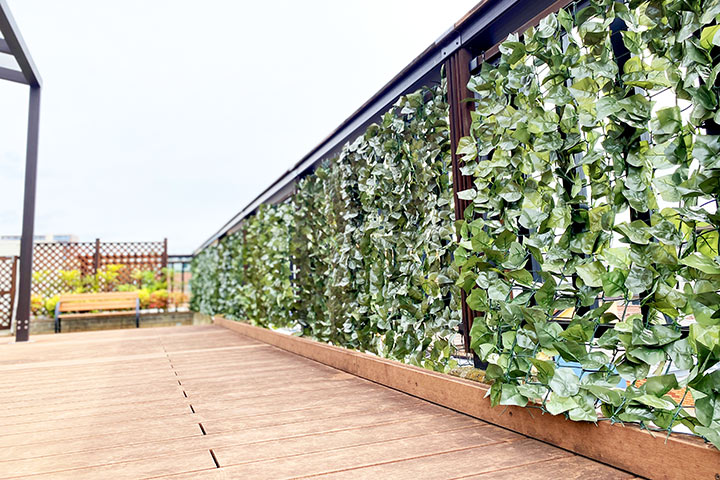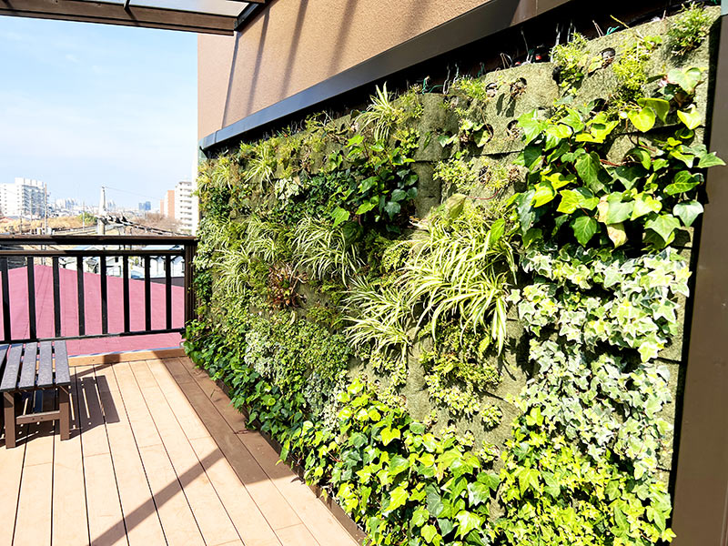 本社の建物壁面の一部に、本物の植物を使用しないみどりのカーテンであるフェイクグリーンウォールを設置いたしました。