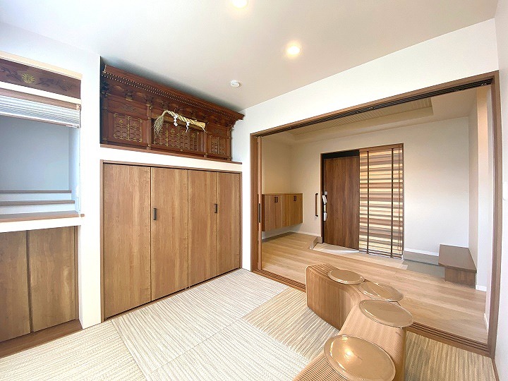 玄関以外分離型の二世帯住宅は、それぞれのプライバシーを守りつつ、コミュニケーションも取りやすい間取りです。来客が多い為、つい長居したくなるような広々した玄関ホールに直接つながる和室がお施主様のこだわりです。