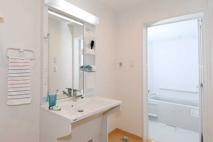 - 洗面台、収納、ウォシュレット機能付き温座トイレ、浴室、エアコン、緊急用コール(3箇所)、一口IHコンロ、室内洗濯機設置スペースあり、冷蔵庫設置スペースあり