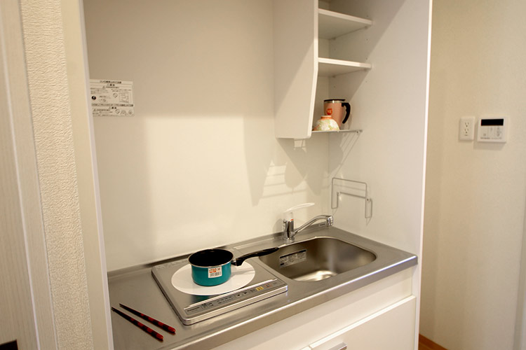 - 洗面台、収納、ウォシュレット機能付き温座トイレ、浴室、エアコン、緊急用コール(3箇所)、一口IHコンロ、室内洗濯機設置スペースあり、冷蔵庫設置スペースあり