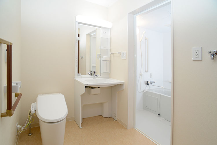 - 洗面台、収納、ウォシュレット機能付き温座トイレ、浴室、エアコン、緊急用コール(3箇所)、一口IHコンロ、室内洗濯機設置スペースあり、冷蔵庫設置スペースあり