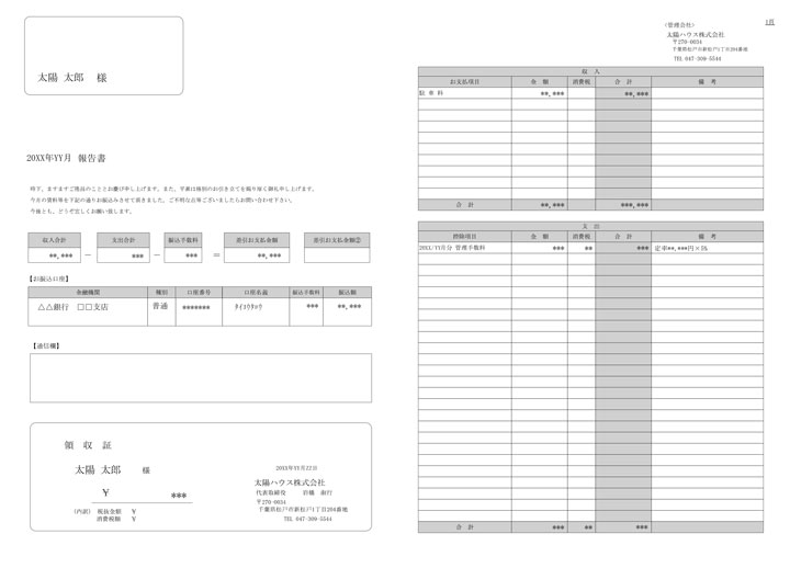 お振込み情報や収支や契約者一覧などが記載された報告書を毎月提出いたします。 報告書の画像をクリックすると、報告書一式のサンプルをご覧いただけます。