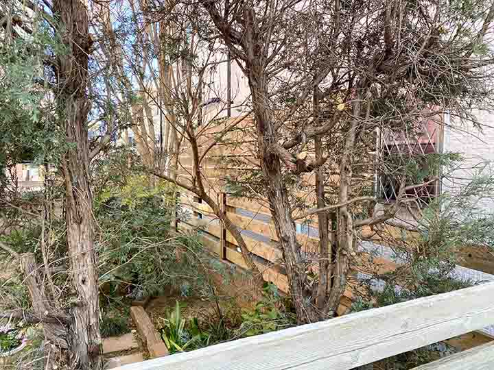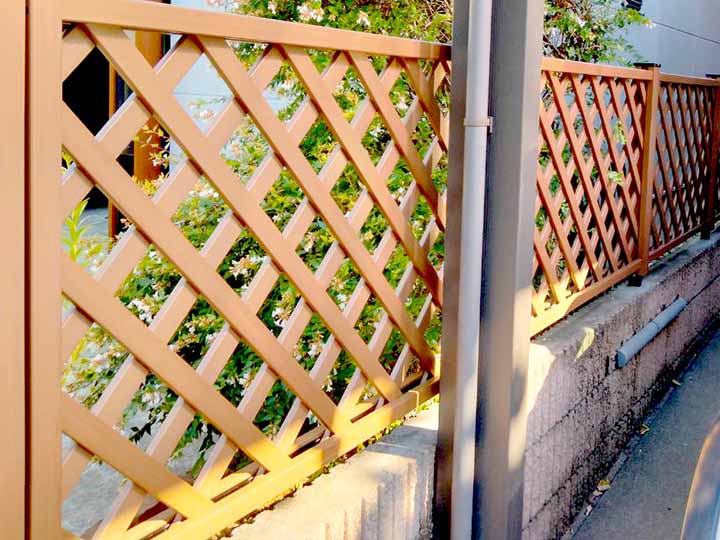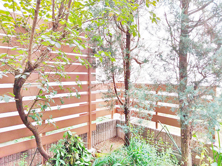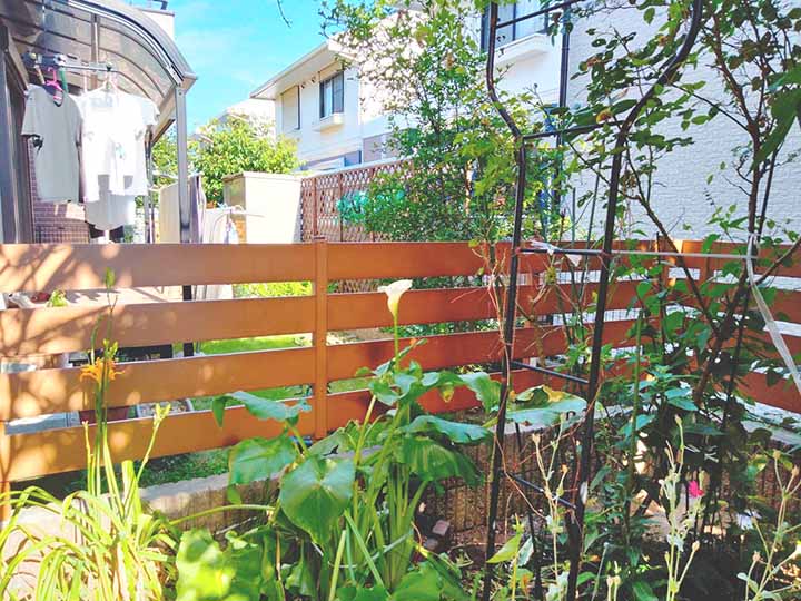 ウッドフェンスはメンテナンスがとても大変なので、今回は木目調の樹脂のフェンスを使用しました。