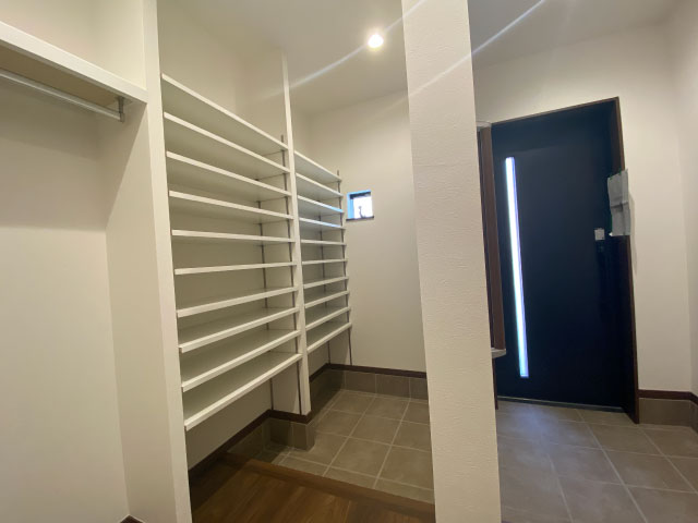 1帖程度のSIC(シューズインクローク)ですが、ベビーカーを中に隠せるので玄関まわりがスッキリ!来客時も安心です。