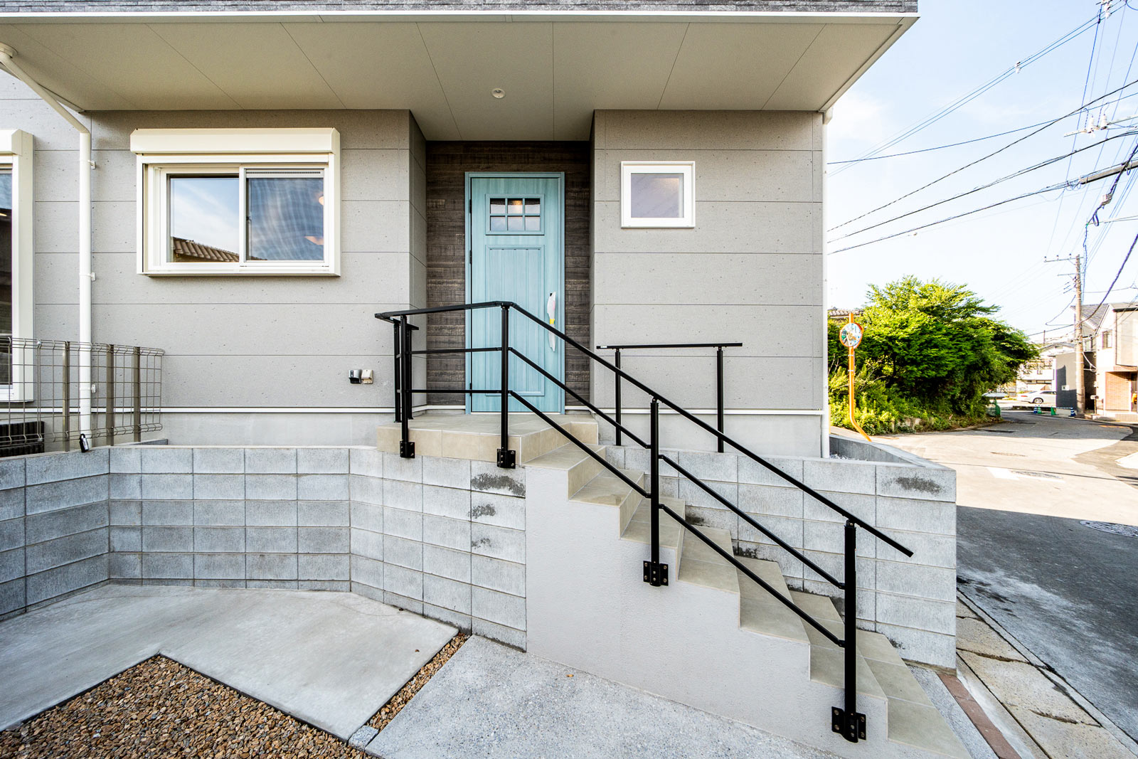 バルコニーが張り出しているため、玄関まわりが雨を避けやすい構造です